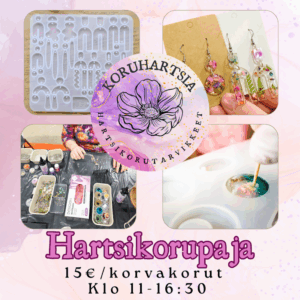 Korupajassa valmistat 15 € materiaalimaksulla upeat korvakorut joko aidoista kukista tai säihkyvästä glitteristä. Samalla tutustut suosittuun hartsitekniikkaan ja nappaat parhaat vinkit hartsikorujen tekemiseen esimerkiksi polttareihin, illanviettoihin tai omaksi harrastukseksi.